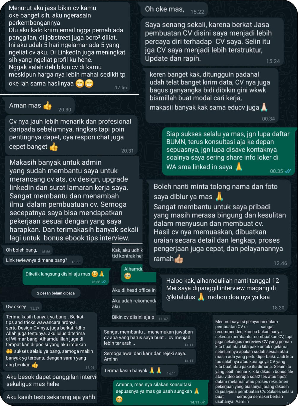 Dibuatkan CV dan lamaran profesional sesuai dengan posisi dan perusahaan yang dipilih dengan format yang sudah terbukti meloloskan ke perusahaan besar